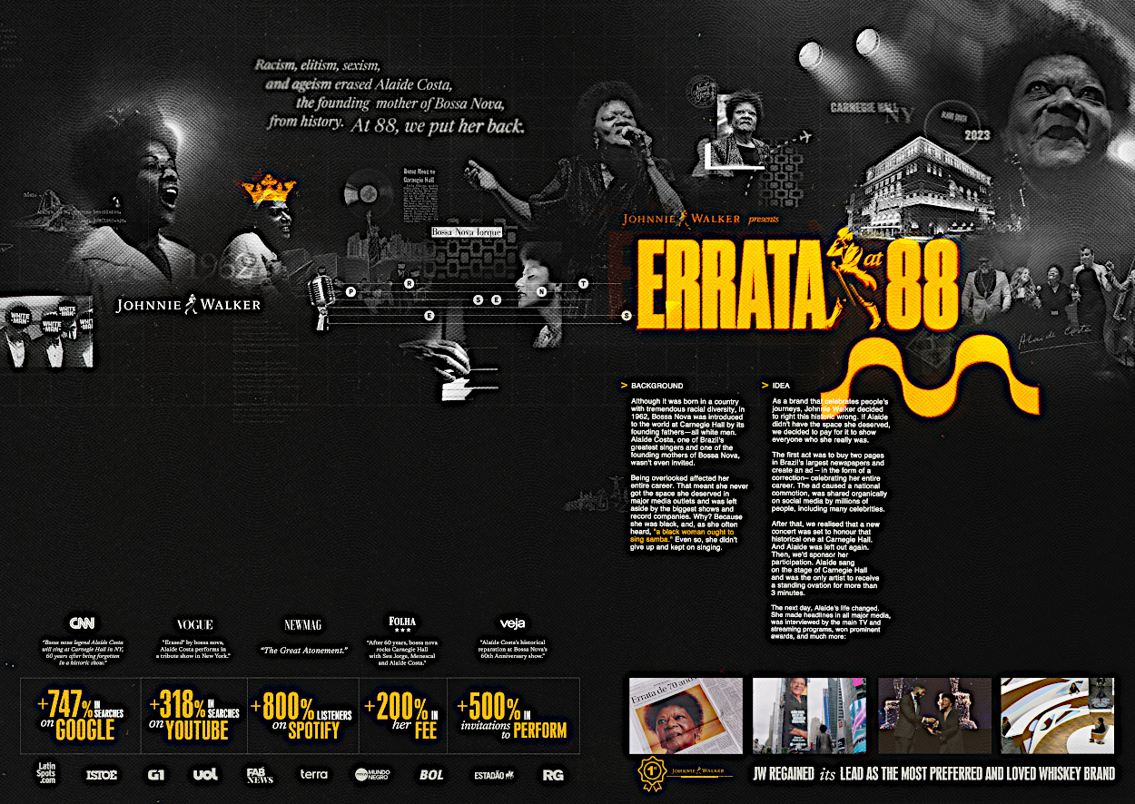 Da 442 entries arrivate agli Entertainment Lions for Music sono stati assegnati 16 Leoni: 3 Ori, 8 Argenti e 15 Bronzi. Il Grand Prix è andato al Brasile con ‘Errata at 88’ per Diageo di AlmapBBDO, São Paulo. Il marchio di whisky Johnnie Walker ha voluto celebrare la fondatrice dimenticata della Bosa Nova, raccontando la storia di Alaíde Costa e riportandola ad esibirsi alla Carnegie Hall dopo sessant'anni. La presidente della Giuria, Madeline Nelson, U.S. Head of Independent Label Relations at Amazon Music, ha detto: “La nostra sfida più grande è stata di approfondire gli insight culturali. Johnnie Walker ha creato una campagna integrata per onorare la storia di Alaíde Costa e riscrivere il suo nome nella storia della Bosa Nova. Abbiamo avuto l'opportunità di premiare un lavoro che genererà nuovi livelli di ispirazione per la comunità creativa. ‘Errata at 88’ fa esattamente questo”.