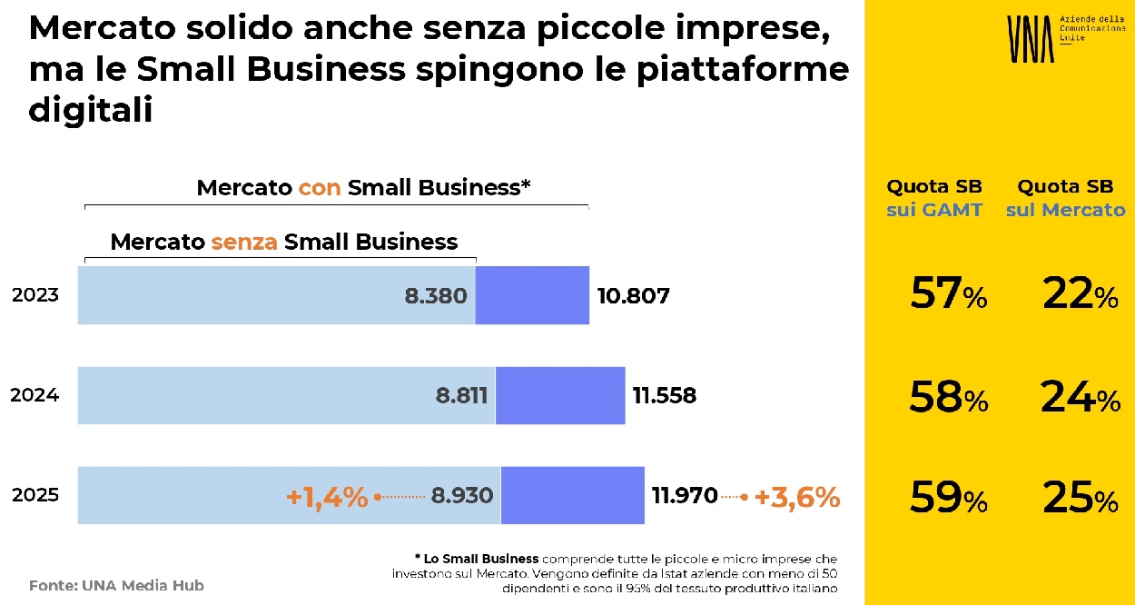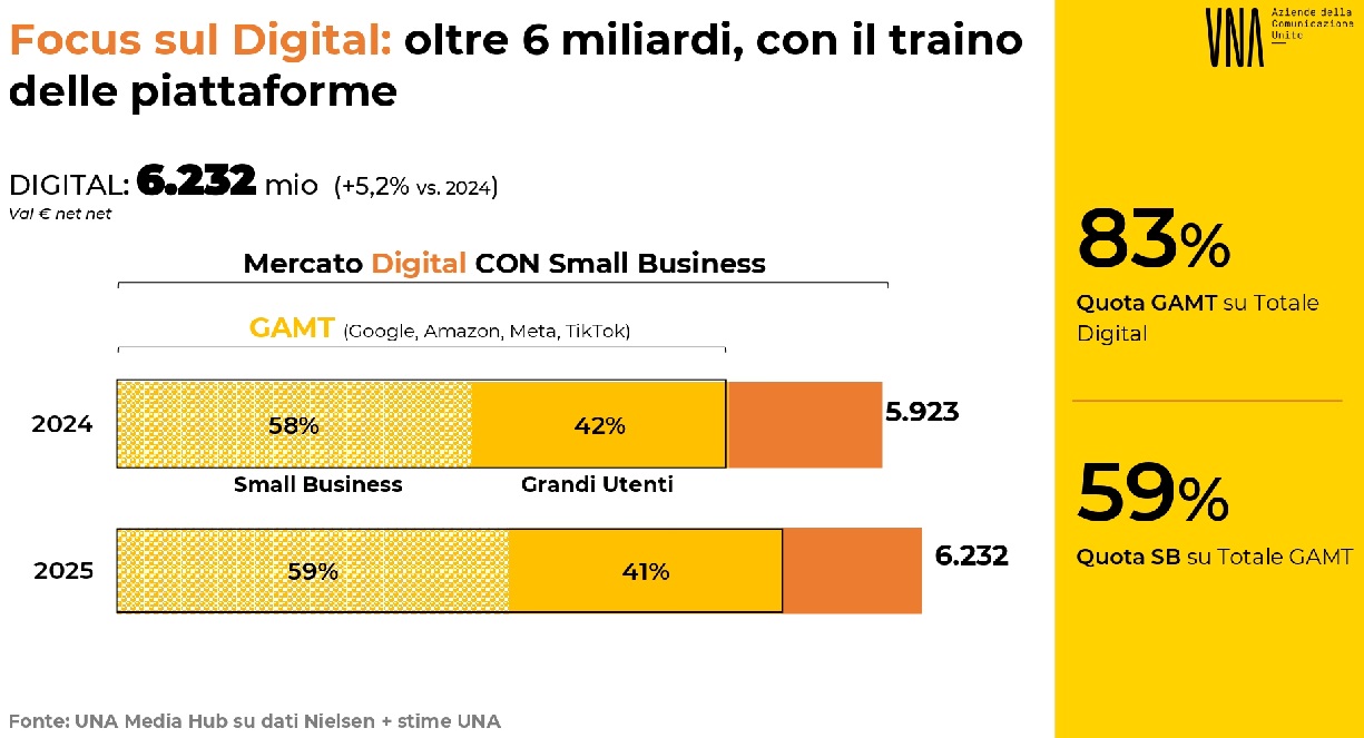 8 lugli. o 2025 - In un periodo storico complesso, segnato da forti tensioni geopolitiche e da un quadro economico instabile, il Media Hub di UNA prevede per il mercato pubblicitario una crescita del 3,6% nel 2025 rispetto al 2024, per un valore complessivo di quasi 12 miliardi di euro, includendo anche la cosiddetta coda lunga, ovvero gli investimenti delle piccole e microimprese, che rappresentano oggi una leva fondamentale per lo sviluppo del digitale, contribuendo per circa il 60% alle revenue generate dalle piattaforme. Al netto dello small business (appannaggio soprattutto degli OTT), il mercato si attesterà a 9 miliardi, con una crescita dell'1,4%.
