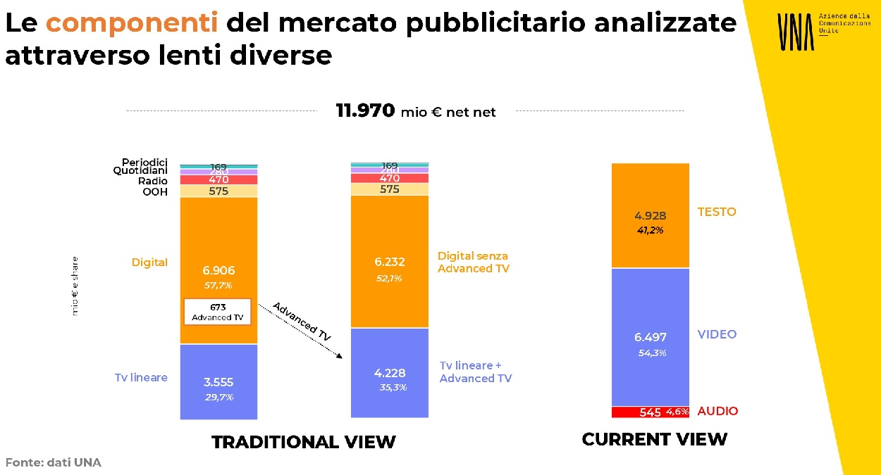 Il Media Hub ha ricostruit. o la stima secondo i formati Audio, Video e Testo. Il Video si conferma protagonista della pianificazione, con un valore prossimo ai 6,5 miliardi di euro e una quota che supera il 54% del mercato. Segue il Testo, che raggiunge i 5 miliardi (41,2%), e l'Audio, che copre il restante 4,6%.
