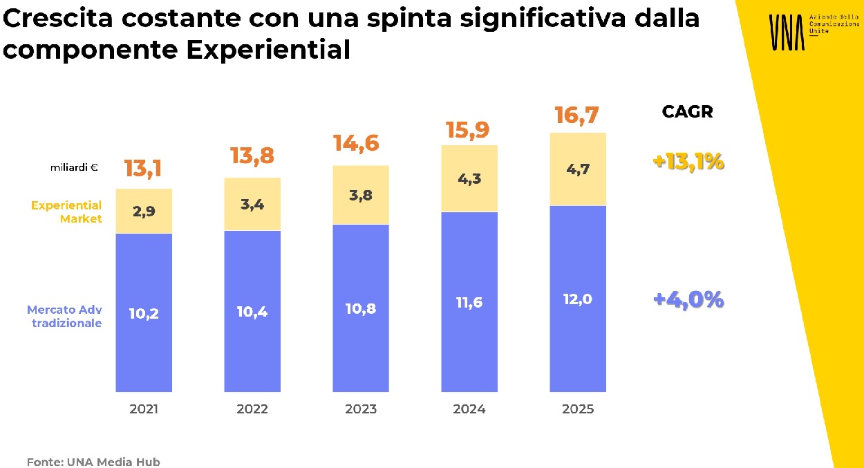 Per u. na visione completa del comparto comunicazione, lo sguardo va allargato all'Experiential Market, segmento che comprende Sponsorizzazioni, Eventi, Branded Content e Influencer Marketing. Ha registrato negli ultimi anni una crescita costante e sostenuta, con un tasso medio annuo del 13,1% dal 2021. Nel 2025, il valore complessivo dell'Experiential Market raggiunge i 4,7 miliardi di euro, con le Sponsorizzazioni che continuano a rappresentare la quota maggiore col 49,8% del totale.
