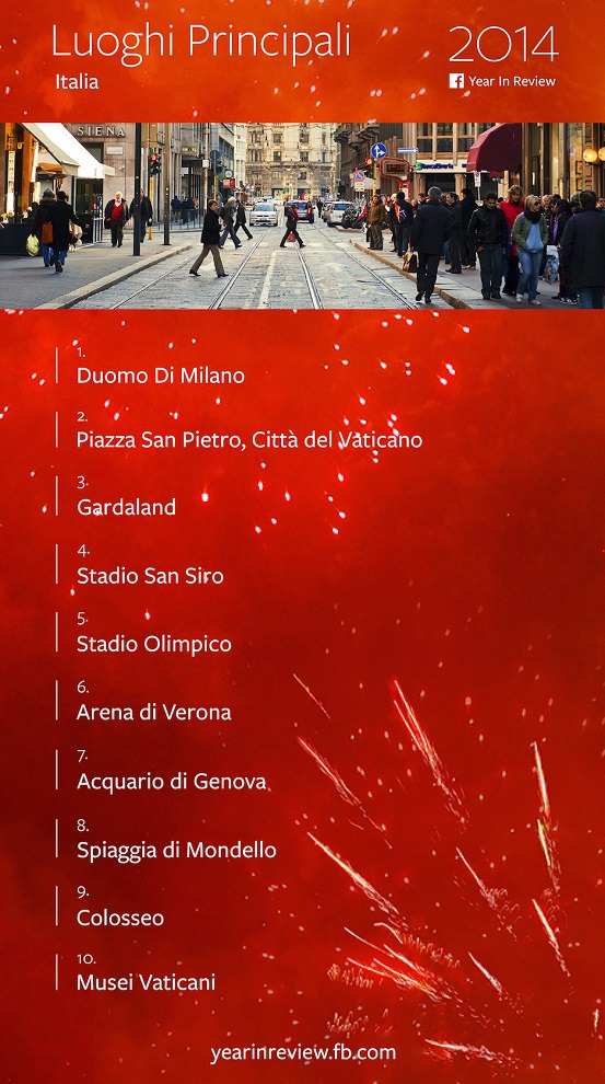 Anche in Italia la Coppa del mondo è stata l'argomento più discusso, seguito dalla Pasqua, da Papa Francesco, da Matteo Renzi e dal Carnevale. Il luogo con più registrazioni è stato il Duomo di Milano, seguito da Piazza San Pietro, Città del Vaticano, da Gardaland e dallo Stadio di San Siro. Ecco l'elenco completo delle top ten italiane: