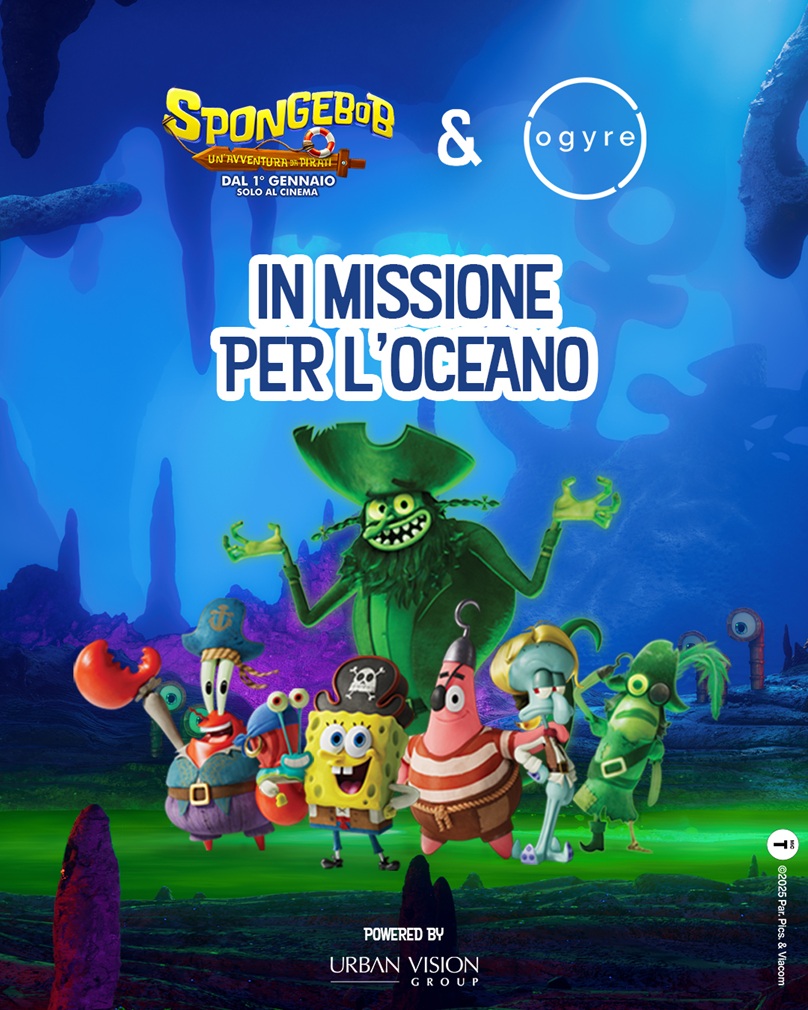 Per l'uscita il 1° gennaio del film ‘SpongeBob: Un'Avventura da Pirati in Italia’ diretto da Derek Drymon, Eagle Pictures sostiene le operazioni di pulizia dei mari di Ogyre, piattaforma globale di fishing for litter, lo annuncia con una campagna di sensibilizzazione con supporto media di Urban Vision Group. Le spugne marine sono fondamentali per l'ecosistema perché depurano l'acqua filtrandola. SpongeBob ‘la spugna più famosa al mondo’ diventa ambasciatrice di un messaggio chiaro e potente, pensato per avvicinare i più piccoli ai concetti di salvaguardia dell'oceano. Il contributo di Eagle Pictures a Ogyre rafforzerà le operazioni di pulizia in mare, supportando le flotte impegnate ogni giorno nella tutela dell'ecosistema marino in Italia, Brasile, Indonesia e Senegal e impegnandosi a raccogliere 5.000 kg di rifiuti marini. Urban Vision Group porterà il messaggio su un circuito di maxi urban led nel centro di Roma e Milano, trasformati in un grande acquario animato da SpongeBob e dai suoi amici. A Milano il 20 dicembre ai piedi del maxi-led screen in corso Vittorio Emanuele, è prevista un'attivazione info-ludica pensata per famiglie e bambini invitati a ‘toccare con mano’ ciò che inquina davvero i nostri mari, attraverso una magic boxGrazie a un QR code, potranno inoltre scoprire come contribuire alla tutela del mare. Il coordinamento creativo e strategico dell'iniziativa è dell'ageznia Cofactory, (17 dicembre 2025)