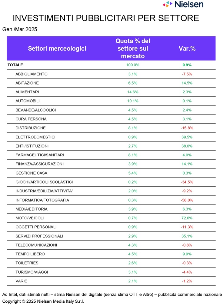 Sono 15 i settori merceologici in crescita in marzo, il contributo maggiore è portato da Alimentari (+7,2%), Servizi professionali (+54%) e Enti/Istituzioni (+61,6%). In calo a marzo gli investimenti di Distribuzione (-18,7%), Turismo/Viaggi (-21,1%) e Bevande/Alcoolici (-15,9%). Relativamente ai comparti con la maggiore quota di mercato, si evidenzia, in gennaio/marzo, l'andamento positivo di Enti/Istituzioni (+38%), Abitazione (+14,5%) e Servizi professionali (+35,1%). In calo invece Informatica/Fotografia (-58%) e Distribuzione (-15,8%).