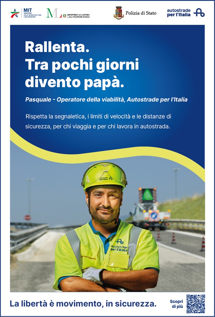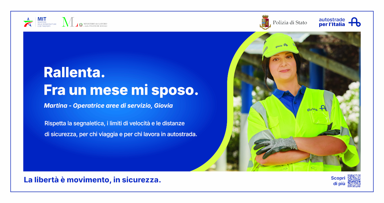Con claim ‘La libertà è movimento, in sicurezza’, la campa. gna ricorda l'importanza del rispetto delle regole stradali, in particolare in prossimità di un'area di cantiere e in presenza di persone al lavoro, dall'attenzione alla segnaletica al rispetto della distanza di sicurezza e dei limiti di velocità. Un'operatrice delle aeree di servizio e un addetto alla viabilità di ASPI hanno prestato i volti alla campagna. Negli annunci compaiono in un fermo immagine con l'headline ‘Rallenta fra pochi giorni divento papà’ e ‘Rallenta fra un mese mi sposo’.
