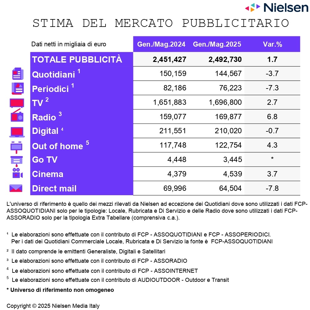 9 luglio 2025 - Secondo i dati Ad Intel Nielsen, il mercato pubblicitario in Italia ha chiuso maggio a +3,4% rispetto a maggio 2024, portando la raccolta del periodo cumulato gennaio-maggio a +2,3%. Se si esclude dalla raccolta web la stima di Nielsen sul search, social, classified (annunci sponsorizzati) e Over The Top, l'andamento nel cumulato si attesta a +1,7%.