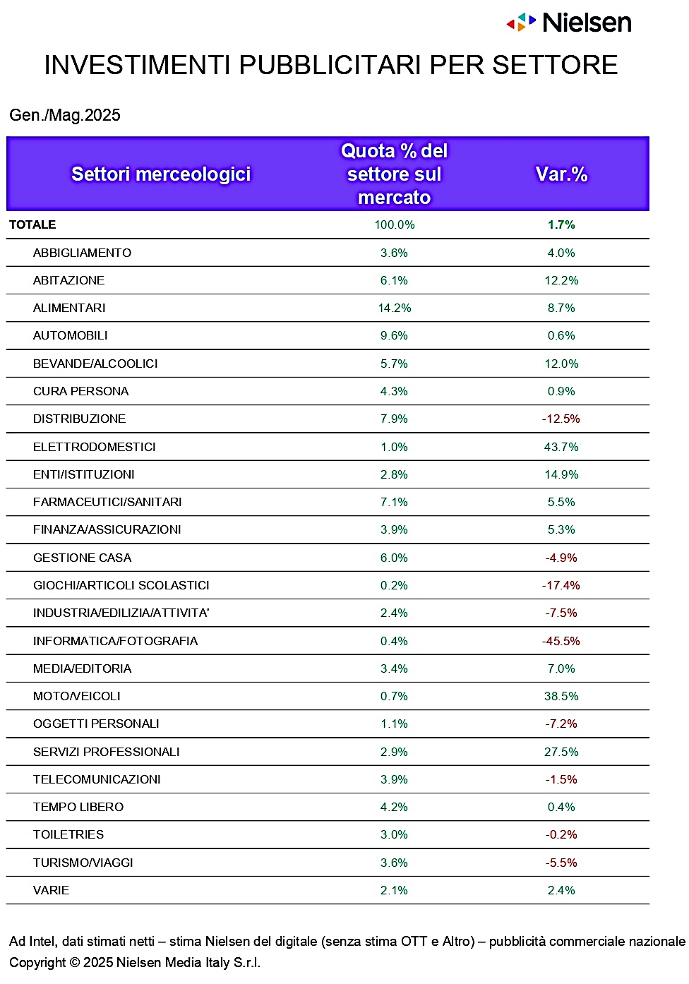 Sono 15 i settori merceologici in crescita in maggio, col contributo maggiore portato da Alimentari (+10,3%), Bevande/Alcoolici (+24,2%), e Elettrodomestici (+84,9%). In calo a maggio gli investimenti di Distribuzione (-8,6%), Gestione casa (-9,6%) e Tempo libero (-12,2%). Relativamente ai comparti con la maggiore quota di mercato, si evidenzia, nel periodo cumulato l'andamento positivo di Alimentari (+8,7%), Bevande/Alcoolici (+12%) e Abitazione (+12,2%). In calo invece Gestione casa (-4,9%), Turismo/Viaggi (-5,5%) e Distribuzione (-12,5%).