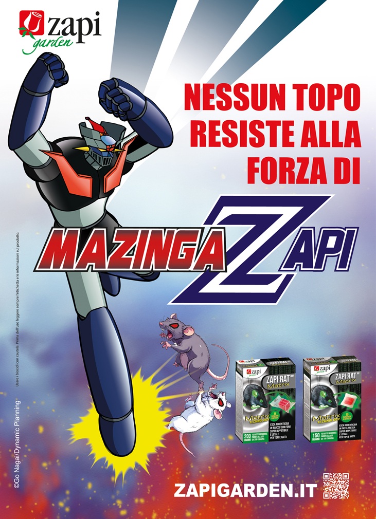 La campagna nasce da un'intuizione del presidente di Zapi, Toshiaki Muramoto: mettere in campo a difesa delle abitazioni un eroe pop, l'iconico Mazinga Z, simbolo di coraggio, potenza e ingegno, nato dalla penna del mangaka e autore giapponese Go Nagai. Giocando sulla Z, l'eroe anime diventa Mazinga Zapi. Claim: ‘Nessun topo resiste alla forza di Mazinga Zapi’. Tra ironia e impatto, l'azienda presenta i rodenticidi tecnologi Matrix, dedicati alla protezione dell'ambiente dai roditori.