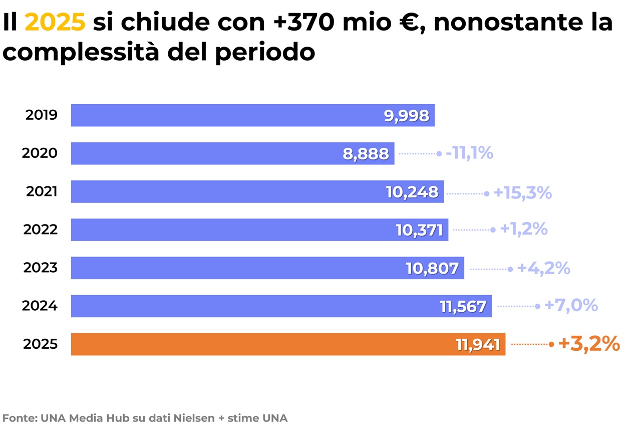 MEDIA HUB UNA. Il mercato pubblicitario chiuderà il 2025 a quasi 12 miliardi, +3.2%. Saranno 12,5 nel 2026