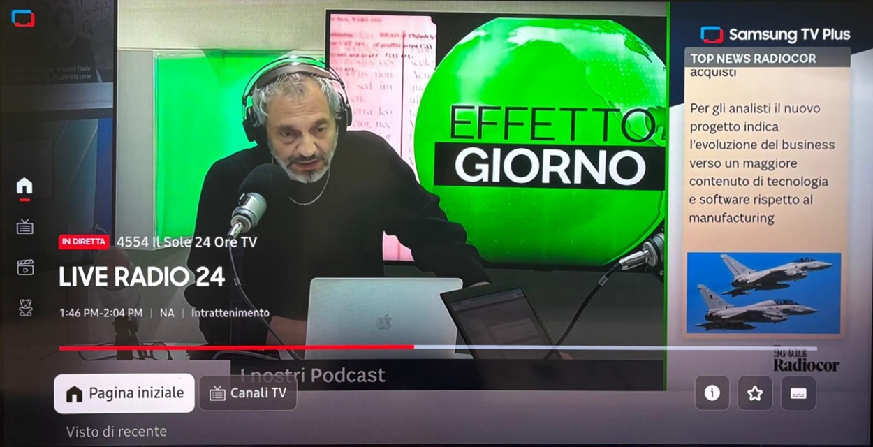 28 nove. mbre 2025 - Il palinsesto televisivo de IlSole24OreTV, già presente in chiaro sul dtt al canale 246, diventa fruibile in streaming anche su Samsung TV Plus, servizio senza abbonamento, integrato e preinstallato sulle smart tv di Samsung, oltre che sui dispositivi Samsung Galaxy. L'iniziativa è in collaborazione con la distributrice Persidera Media, operatore di rete indipendente italiano.