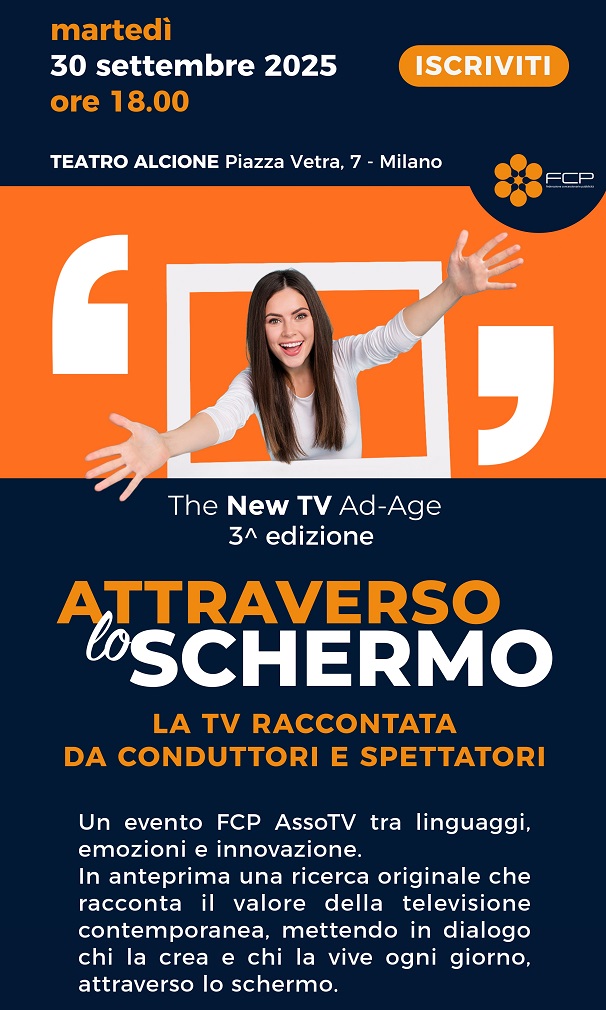 Si terrà il 30 settembre a Milano, al Teatro Alcione dalle 18, ‘The New Tv Ad-Age – Attraverso lo schermo’, evento promosso da FCP-AssoTV per riflettere sul presente e sul futuro della comunicazione video. Alla terza edizione, per la prima volta saranno gli stessi conduttori della tv italiana a raccontare l'evoluzione del mezzo televisivo come strumento di relazione, impatto culturale e valore per le marche. Saranno presentati in anteprima i risultati di una ricerca originale promossa da FCP-AssoTV che, al di là dei numeri rilevati da Auditel, indaga le motivazioni, le emozioni, le modalità e i contesti con cui oggi si guarda la televisione: non solo quanti, ma perché, come e con chi, con quanta attenzione e con quanta soddisfazione. Per info: direzione@fcponline.it. (8 luglio 2025)