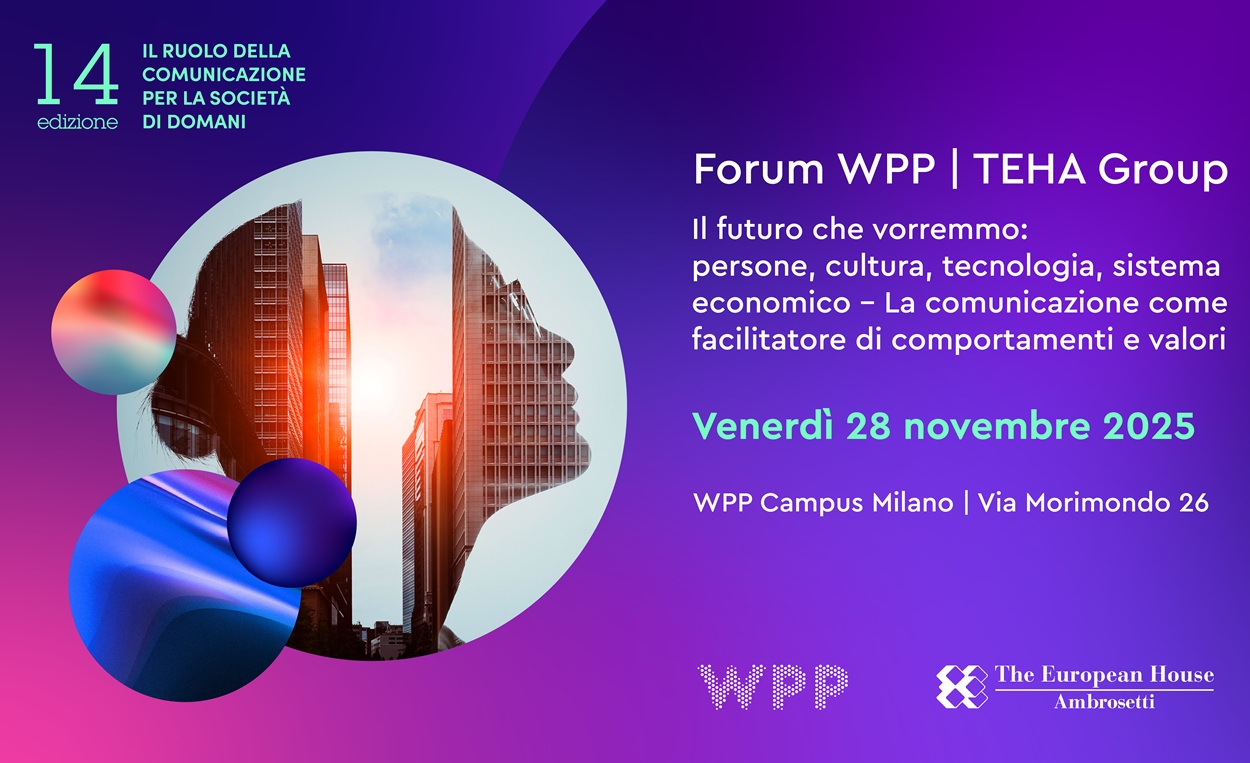 Sarà dedicata al tema ‘Il futuro che vorremmo: persone, cultura, tecnologia, sistema economico - La comunicazione come facilitatore di comportamenti e valori’ la 14a edizione del Forum WPP, organizzato con TEHA Group, che si terrà il 28 novembre a Milano. Verranno analizzate le principali strategie per promuovere un nuovo paradigma di società 5.0, offrendo una piattaforma di riflessione su come costruire un futuro che bilanci progresso tecnologico e coesione sociale, competitività economica e sostenibilità ambientale, crescita individuale e responsabilità collettiva. Figure di spicco del mondo della comunicazione, del business e delle istituzioni discuteranno i risultati emersi dall'Advisory Board WPP | TEHA Group, che dal 2012, analizza il ruolo della comunicazione come strumento per lo sviluppo e la competitività del Paese e fornisce nuove chiavi di lettura per orientare i decision maker. La partecipazione è su invito. (13 novembre 2025)