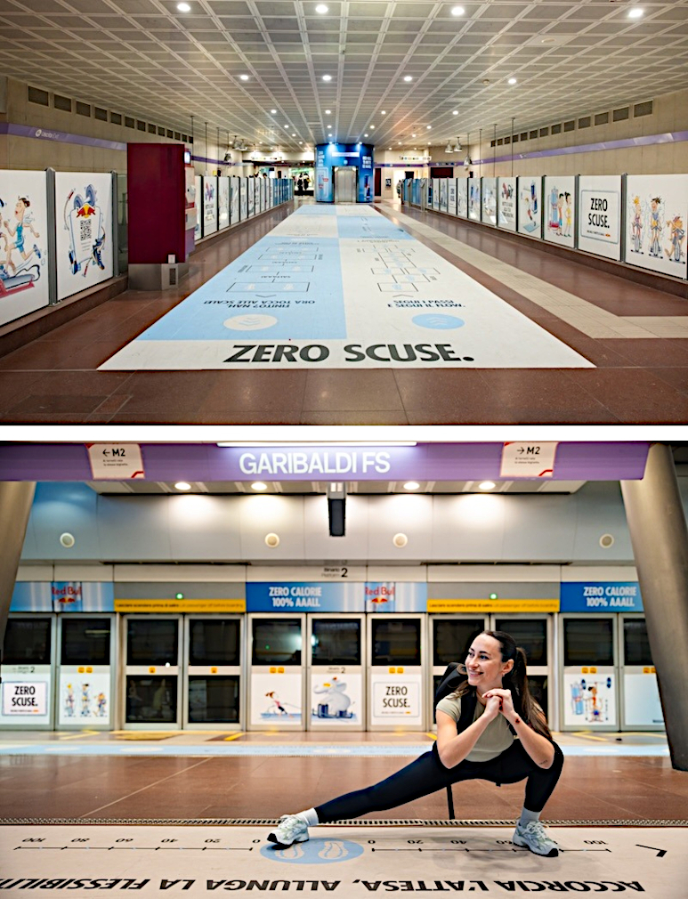 Red Bull ha trasformato la stazione Garibaldi della metro M5 a Milano in un hub interattivo sul benessere quotidiano per il lancio della nuova Red Bull Zero senza zuccheri. La campagna ‘Zero Scuse’ è un invito ai viaggiatori ad aumentare i passi e ad adottare uno stile di vita quotidiano più dinamico. Per due settimane fino all'11 maggio ogni angolo della stazione è coinvolto in questa attivazione. Nel corridoio di accesso prima dei tornelli, i passeggeri trovano una grafica a pavimento interattiva con esercizi suggeriti: squat, jumping jack, calci all'indietro, alzate sulle punte, affondi, tocco delle punte e persino una proposta di stretching dinamico. Sulle banchine, una serie di visual propone mini-esercizi da fare in attesa del treno. Un intero treno della metro lilla è inoltre decorato con contenuti esperienziali e messaggi ispirazionali. La domination è ideata da Andrea Zaffaroni di Red Bull Content Pool. (5 maggio 2025)